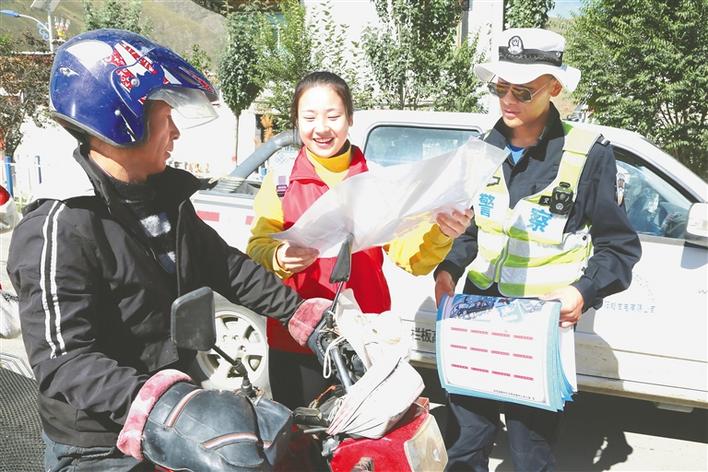 圖為瓊結(jié)縣新時代文明實踐中心志愿者向行人發(fā)放“文明交通 從我做起”宣傳資料。