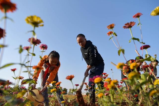 寨下鎮(zhèn)中心小學的學生們在花田勞動,給花松土、澆水(11月9日攝)。