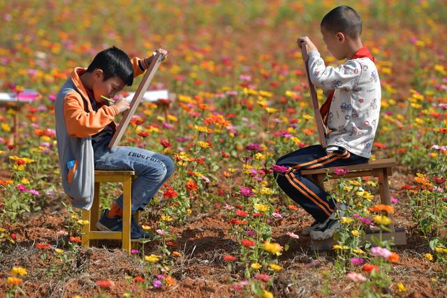 寨下鎮(zhèn)中心小學的學生們在花田寫生(11月9日攝)。新華社記者 彭昭之 攝