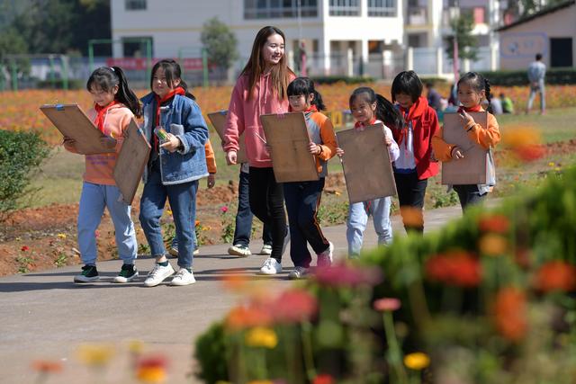寨下鎮(zhèn)中心小學的學生們前往花田上美術課(11月9日攝)。