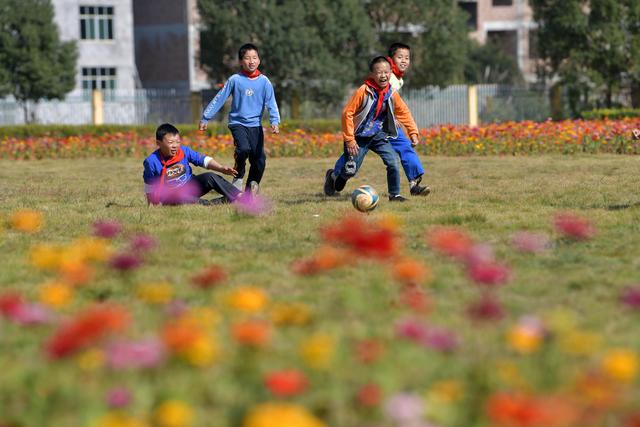 寨下鎮(zhèn)中心小學的學生們在花田間的草地上踢足球(11月9日攝)。