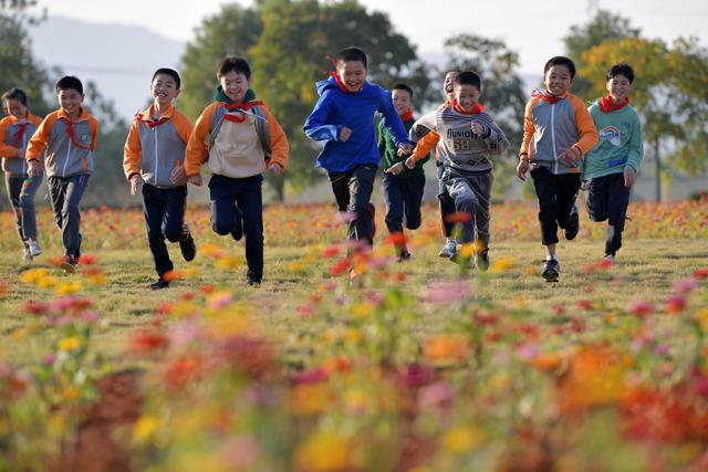 寨下鎮(zhèn)中心小學的學生們在花田間的綠地玩耍(11月9日攝)。
