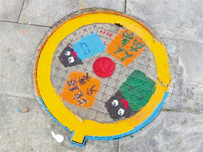 以環(huán)保、垃圾分類為主題的各種彩繪圖案覆蓋上了井蓋,使得原本黑乎乎的井蓋一下變得活潑生動起來。