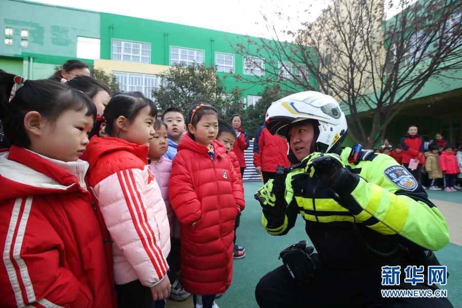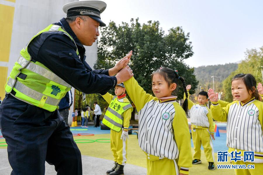 11月30日,交警在位于濟南市的山東省實驗幼兒園南校區(qū)指導(dǎo)孩子們識別交通安全標(biāo)識牌。新華社發(fā)(郝群英 攝)