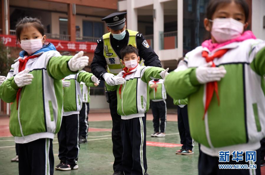 11月30日,河北省邯鄲市公安局交巡警支隊叢臺一大隊的民警在指導(dǎo)叢臺小學(xué)的學(xué)生們學(xué)習(xí)交通指揮手勢。新華社發(fā)(郝群英 攝)