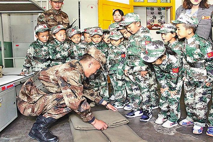 圖為日喀則軍分區(qū)某團官兵為小學生們演示疊軍被。