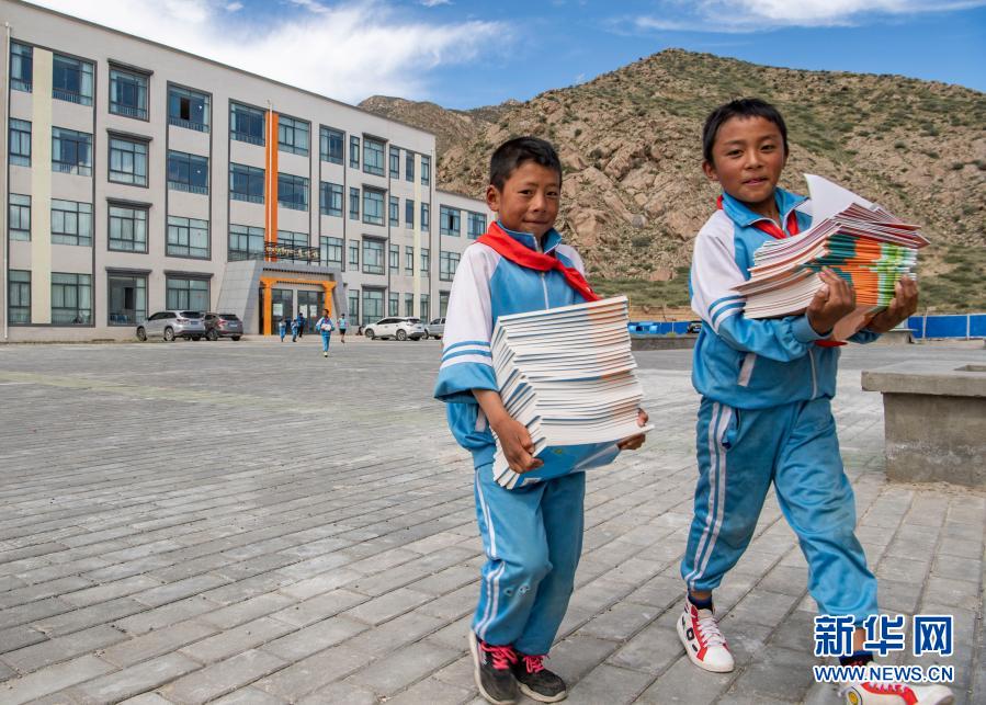 在山南市貢嘎縣森布日幸福家園九年一貫制學(xué)校,剛開(kāi)學(xué)的孩子們搬新書(8月24日攝)。新華社記者 孫非 攝