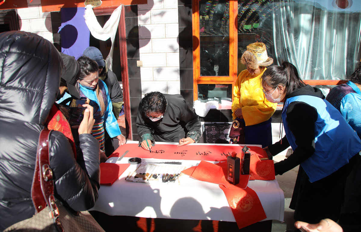 西藏自治區(qū)書協(xié)副主席、拉薩市書協(xié)副主席南杰旺扎說:“值此新春佳節(jié)和藏歷新年來臨之際,拉薩市文聯(lián)書法家協(xié)會(huì)組織了三位老師來到吉蘇村開展送書法活動(dòng),一是宣傳黨的好政策,二是雙節(jié)臨近給基層干部群眾送上節(jié)日的祝福?!?/p>
