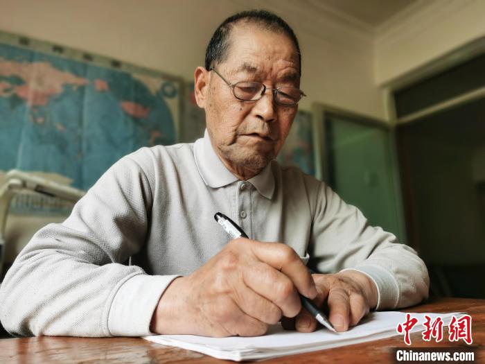 圖為在青海西寧頤養(yǎng)天年的朱汝完向記者展示氣象發(fā)報(bào)基本功?!?zhí)砀?攝