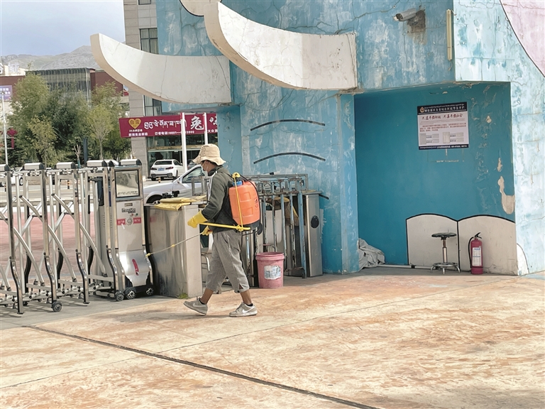 圖為在德吉羅布兒童樂(lè)園入口處,工作人員正在進(jìn)行消毒作業(yè)。 拉薩融媒見(jiàn)習(xí)記者 索朗曲珍攝