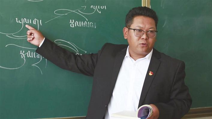 西藏大學(xué)文學(xué)院白瑪央金老師為學(xué)生教授藏文課。記者 洛?!∫?jiàn)習(xí)記者 王敏 旦增蘭澤 攝