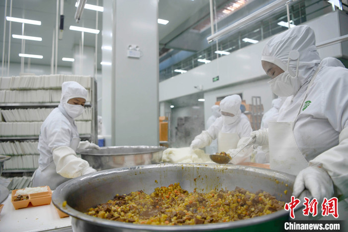 圖為3月11日,西藏自治區(qū)拉薩市城關(guān)區(qū)凈土拉薩中央廚房配餐車(chē)間內(nèi),工作人員正在為學(xué)生集中配餐。 中新社記者 貢嘎來(lái)松 攝
