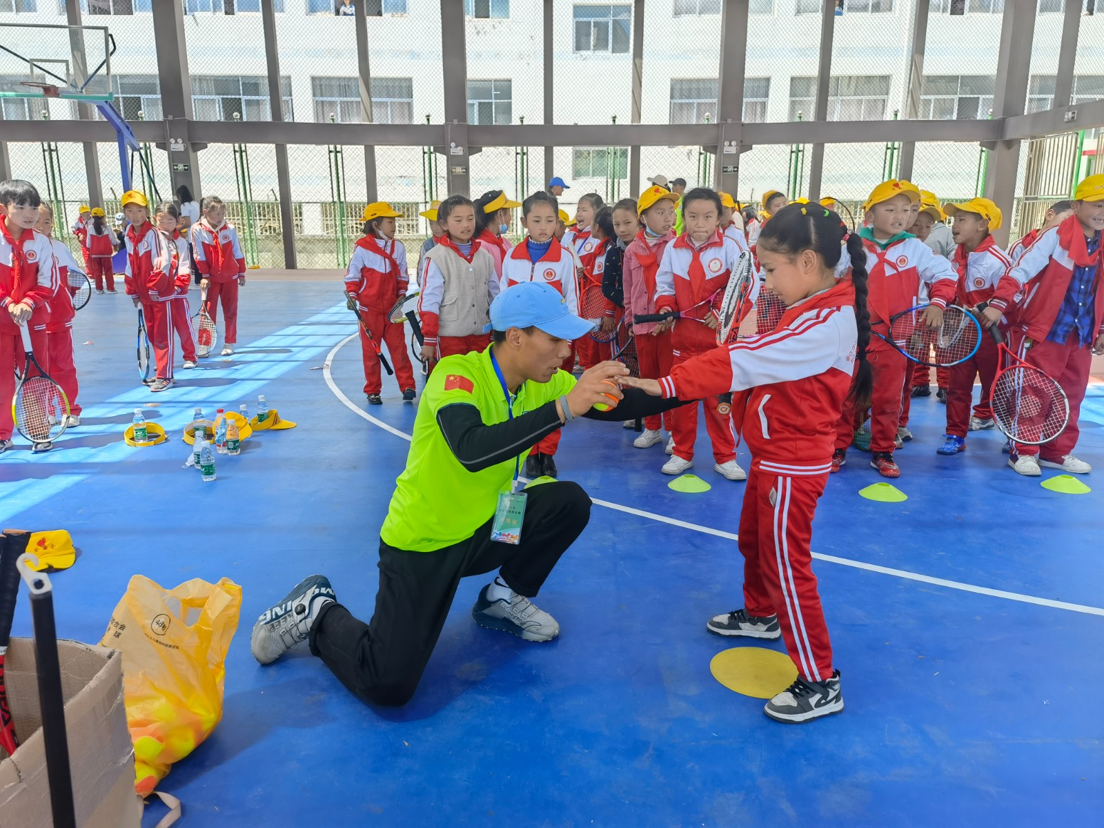 圖為西藏自治區(qū)網(wǎng)球協(xié)會向?qū)W校師生捐贈網(wǎng)球裝備