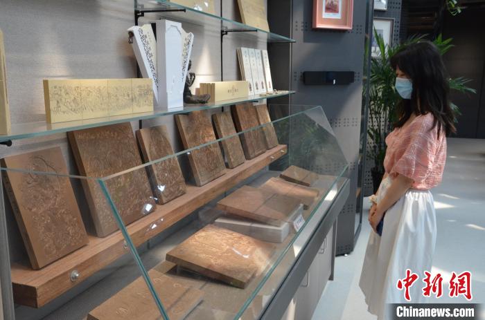 圖為參訪人員在工作室參觀敦煌題材木刻版畫?!±顏嘄?攝