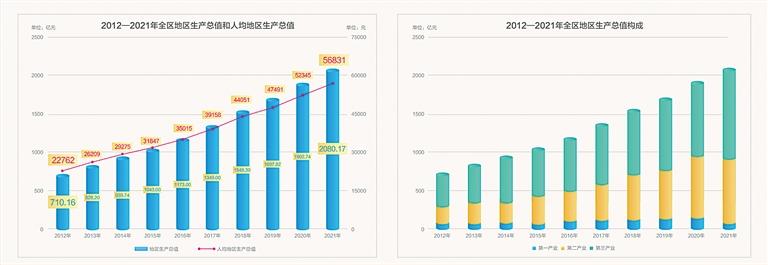 經(jīng)濟健康快速發(fā)展,地區(qū)生產(chǎn)總值由2012年的710.16億元增長至2021年的2080.17億元。十年來,西藏地區(qū)生產(chǎn)總值增長了152.6%,年均增長9.7%。