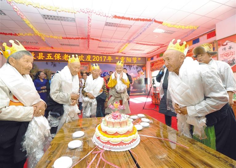 社會保障兜底一批。2021年,農(nóng)村居民最低生活保障標準達到5060元/年/人,城鎮(zhèn)居民最低生活保障標準達到10920元/年/人。圖為2017年10月28日,西藏自治區(qū)拉薩市達孜區(qū)特困人員集中供養(yǎng)服務(wù)中心為80歲老人們集體過生日。