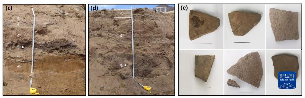 圖(c)(d)分別為共塘遺址調(diào)查剖面1和剖面2地層(三角形表示陶片位置)。圖(e)為本研究所分析的陶片照片。(資料圖片由第二次青藏科考隊(duì)“人類活動(dòng)歷史及其影響”分隊(duì)提供)
