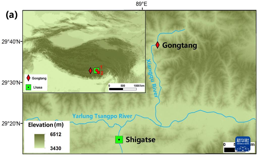 圖(a)為雅魯藏布江中游部分地區(qū)遺址背景資料圖,曲貢(1)、邦嘎(2)和共塘遺址位置(紅色菱形所示)。(資料圖片由第二次青藏科考隊(duì)“人類活動(dòng)歷史及其影響”分隊(duì)提供)