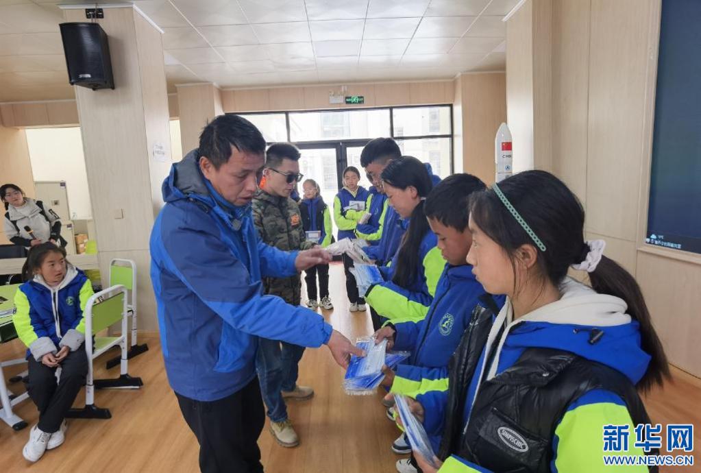 福建省第十批援藏工作隊教育組教師代表正在為學生們發(fā)放書籍和口罩。