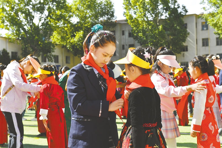 拉薩市第三小學(xué)少先隊(duì)老隊(duì)員為新入隊(duì)隊(duì)員系紅領(lǐng)巾。記者 次仁平措 攝