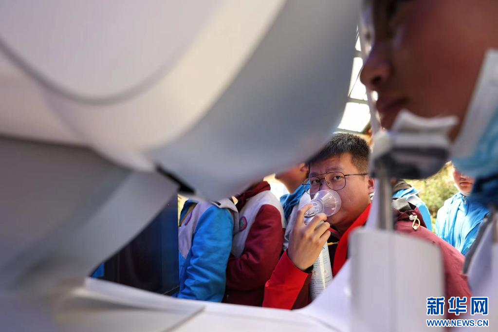 在西藏自治區(qū)那曲市色尼區(qū)第二中學(杭嘉中學),志愿者陳坤一邊吸氧一邊為學生驗光(6月22日攝)。新華社發(fā)(趙穎碩 攝)