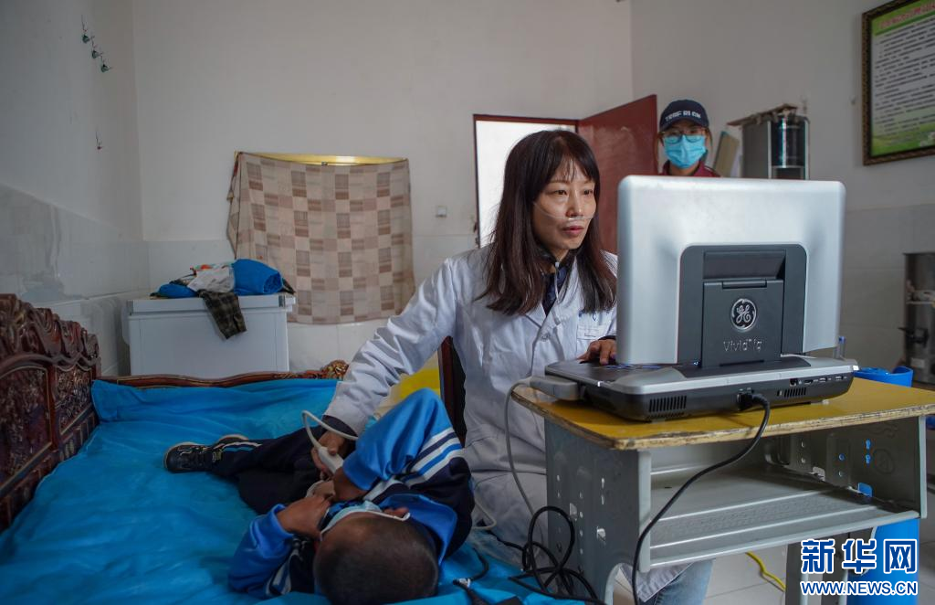 7月4日,江蘇省援藏醫(yī)療隊醫(yī)生陳晴玉在給疑似患兒做心臟彩超。(新華社記者 邵澤東 攝)