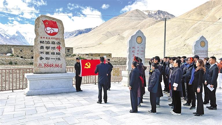 圖為聯(lián)創(chuàng)共建活動(dòng)中,20余名黨員在“珠峰領(lǐng)航”石碑前重溫入黨誓詞。記者 索朗瓊珠 攝