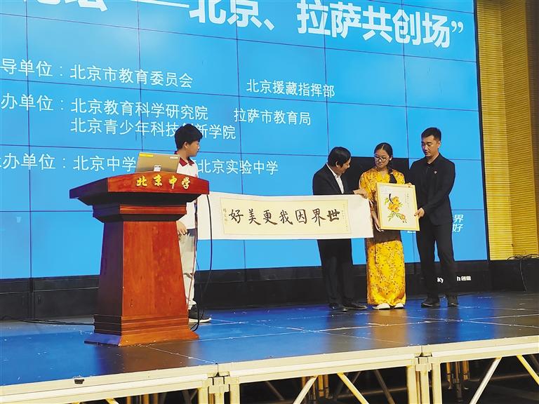 圖為拉薩北京實(shí)驗(yàn)中學(xué)學(xué)生向友好學(xué)校贈(zèng)送禮物。
