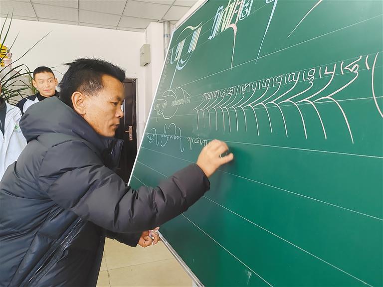 圖為洛桑多吉老師為學(xué)生們傳授藏文書法知識(shí)。