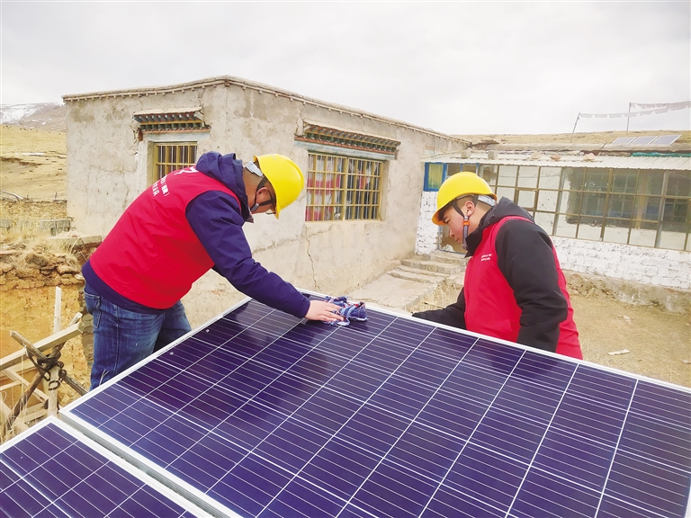 “次桑在家嗎?我們過來看一下你們新年準(zhǔn)備得怎么樣了?”聽到劉光輝的呼喚,孩子們都跑出來迎接這位“小黃帽”叔叔。劉光輝和羅桑歐珠進(jìn)屋放下年貨,顧不上休息,立馬搭梯子爬上次桑家的房頂,用抹布拂去光伏電板上的塵土,拿出工具仔細(xì)檢查電源和光伏設(shè)備是否有損壞?!按紊<矣玫氖俏覀兊牡谝淮柲芄夥姲?,這個(gè)電板要經(jīng)常擦拭,保持表面干凈,發(fā)電效率會更好。”劉光輝說。檢修完光伏電板后,劉光輝和羅桑歐珠又回到屋內(nèi)檢查次桑家的電路線路,對插排插座等可能存在安全隱患的地方進(jìn)行認(rèn)真排查。確保沒有問題后,兩人將之前昏暗的燈泡全部換成了最新的節(jié)能燈泡,整個(gè)屋子一下亮堂了起來。