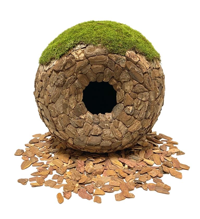 嘎瑪次仁的作品聚焦生態(tài)環(huán)境,作品《意象·自然》,是對“自然”理解的一種概念性的抽象表達(dá)。其形式上為一個(gè)中空球形裝置,表面為拼貼的樹皮,頂部種植有苔蘚。正面的部分區(qū)域內(nèi)陷,中間為一孔洞,為了更凸顯出洞中的“黑暗”與“未知”,內(nèi)部涂有特殊啞光涂料。為了體現(xiàn)出“生命感”,他在作品內(nèi)部安裝了感應(yīng)發(fā)聲裝置,感知到人靠近后會(huì)發(fā)出輕微的心跳聲。