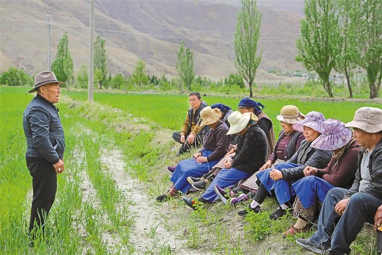 山南市瓊結(jié)縣老黨員尼木在下水鄉(xiāng)措杰村的田間地頭給村民黨員講黨課。記者 白瑪澤旺 通訊員 倫珠澤仁 攝