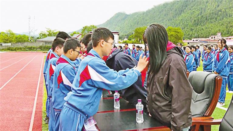 學生為老師系紅領巾。記者 胡文 通訊員 旦珍 攝