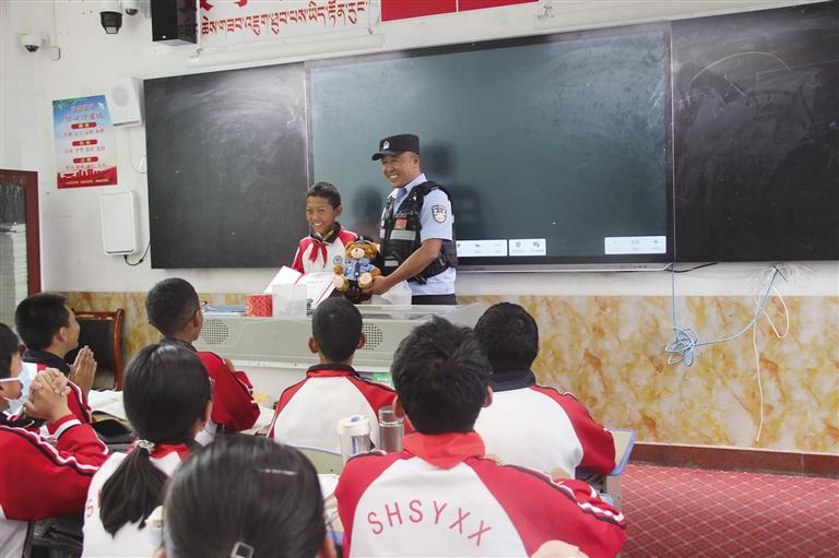 民警利用課間休息時間向次仁扎西頒發(fā)印有“拾金不昧、品德高尚”的榮譽證書并送上“警察小熊”。圖由桑珠孜公安提供