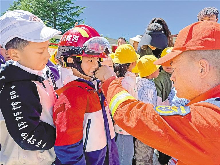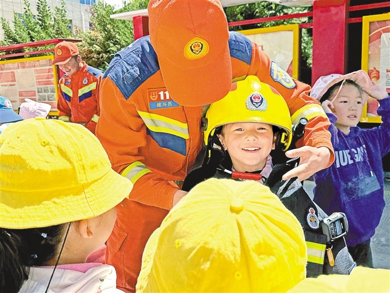 山南市湖南路特勤站消防員為小朋友試戴消防頭盔。