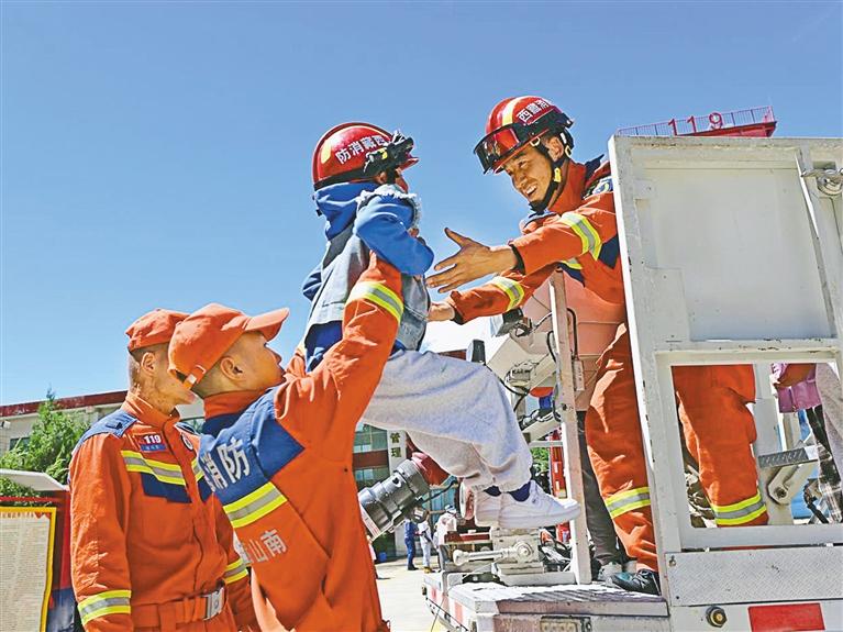 在山南市湖南路特勤站,小朋友在消防員陪同下體驗乘坐云梯車。