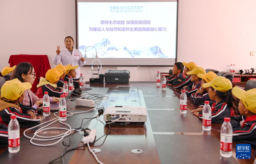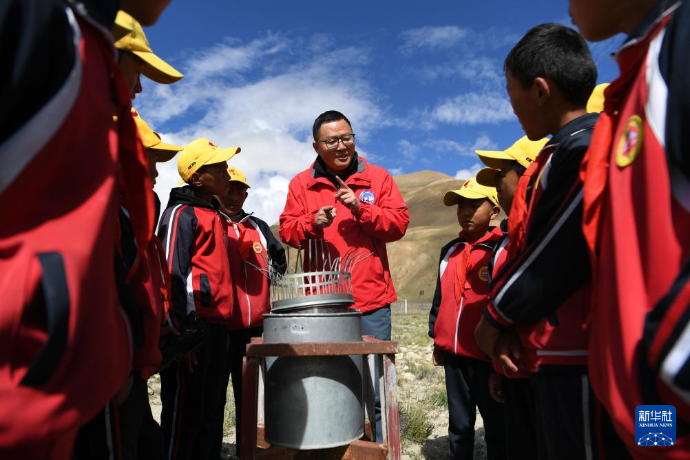 9月5日,在珠穆朗瑪大氣與環(huán)境綜合觀測(cè)研究站,西藏自治區(qū)生態(tài)環(huán)境監(jiān)測(cè)中心工程師索娜卓嘎為學(xué)生們科普生態(tài)環(huán)境監(jiān)測(cè)意義。新華社記者 張汝鋒 攝