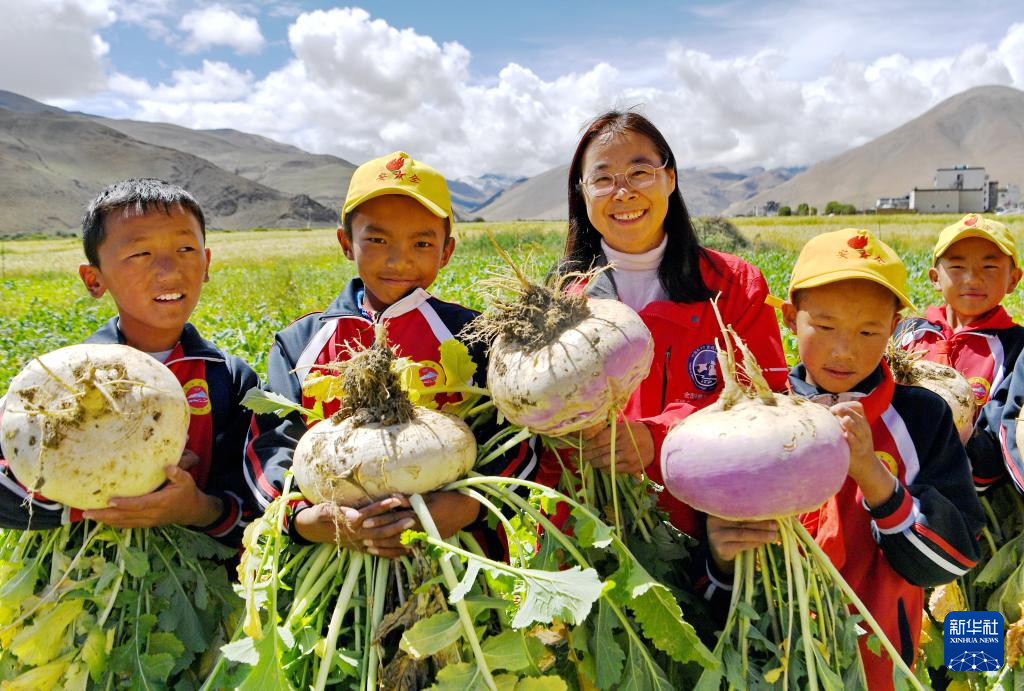 9月5日,在珠峰腳下的田地里,中國(guó)科學(xué)院青藏高原研究所副研究員、中國(guó)生態(tài)學(xué)學(xué)會(huì)高寒生態(tài)專業(yè)委員會(huì)委員姜麗麗(中)和學(xué)生們一起展示收獲的蕪菁。新華社記者 張汝鋒 攝