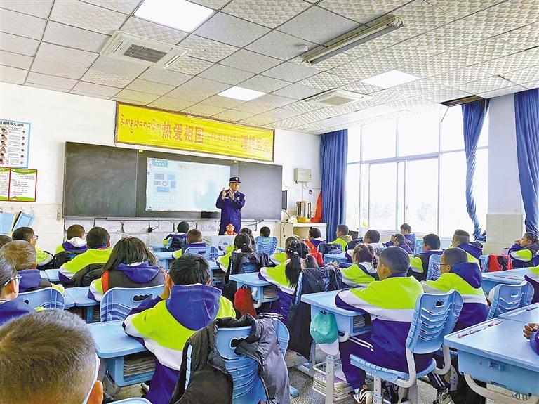 圖為消防工作人員向?qū)W生講解消防應急知識。記者 巴桑旺姆 攝
