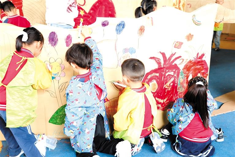 孩子們圍在用手繪作品組成的“蛋糕”旁。