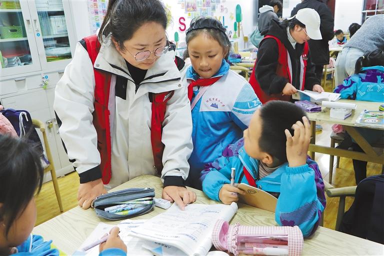 圖為志愿者為孩子輔導(dǎo)作業(yè)。記者 謝筱純 王珊 攝