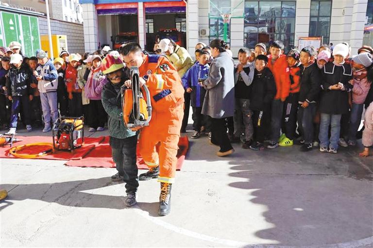 圖為學(xué)生體驗消防器材。記者 貢秋曲措 攝