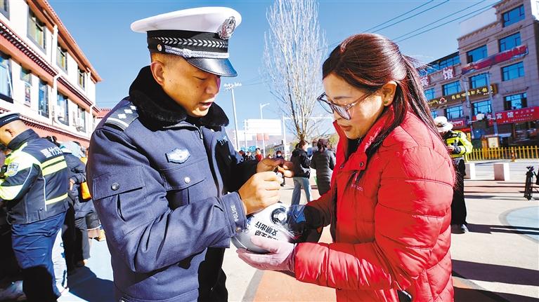 圖為民(輔)警向群眾免費發(fā)放頭盔。記者 格桑倫珠 通訊員 果珍 攝