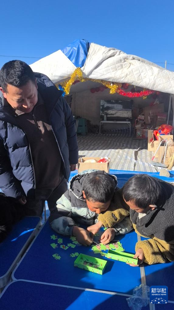 長所鄉(xiāng)森嘎村的孩子們在“溫暖小屋”外拼拼圖(1月21日攝)。新華社發(fā) 德央 攝