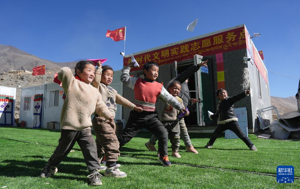 1月24日,定日縣古榮村安置點的孩子們在放飛紙飛機。新華社記者 晉美多吉 攝