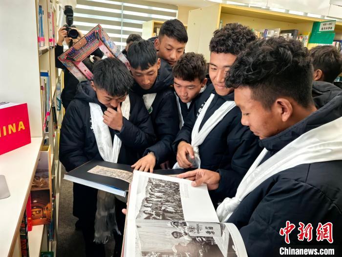 2月20日,參加“跨越山海 以球會友”藏港青少年足球交流活動的西藏自治區(qū)青少年在香港中華基金會中學(xué)圖書館翻閱介紹西藏的圖冊?!≈行律缬浾?劉大煒 攝
