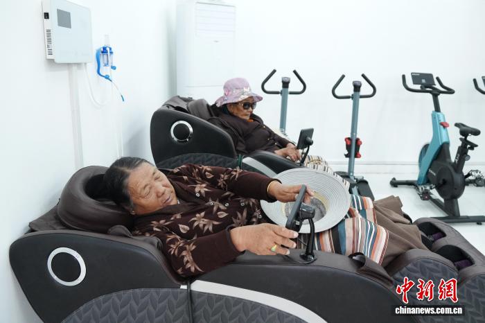 在活動室,78歲的白瑪躺在按摩椅中享受按摩服務(wù)。她告訴記者,兒子平日在外上班,她的一日三餐都在驛站。娛樂休閑之余,她對按摩椅很感興趣,每天都用1個小時疏通筋骨。和記者交流時一次按摩結(jié)束,白瑪熟練地在操作屏上再次按下啟動按鈕。
