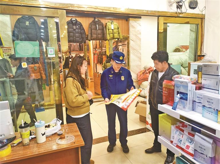 拉薩市消防救援支隊宣傳員為商貿(mào)市場商鋪店主強(qiáng)調(diào)消防安全。