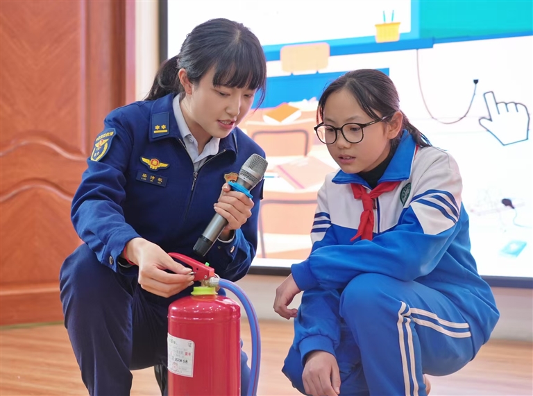 學(xué)校師生在消防員指導(dǎo)下體驗(yàn)滅火器撲滅初起火災(zāi)。肖暄 攝