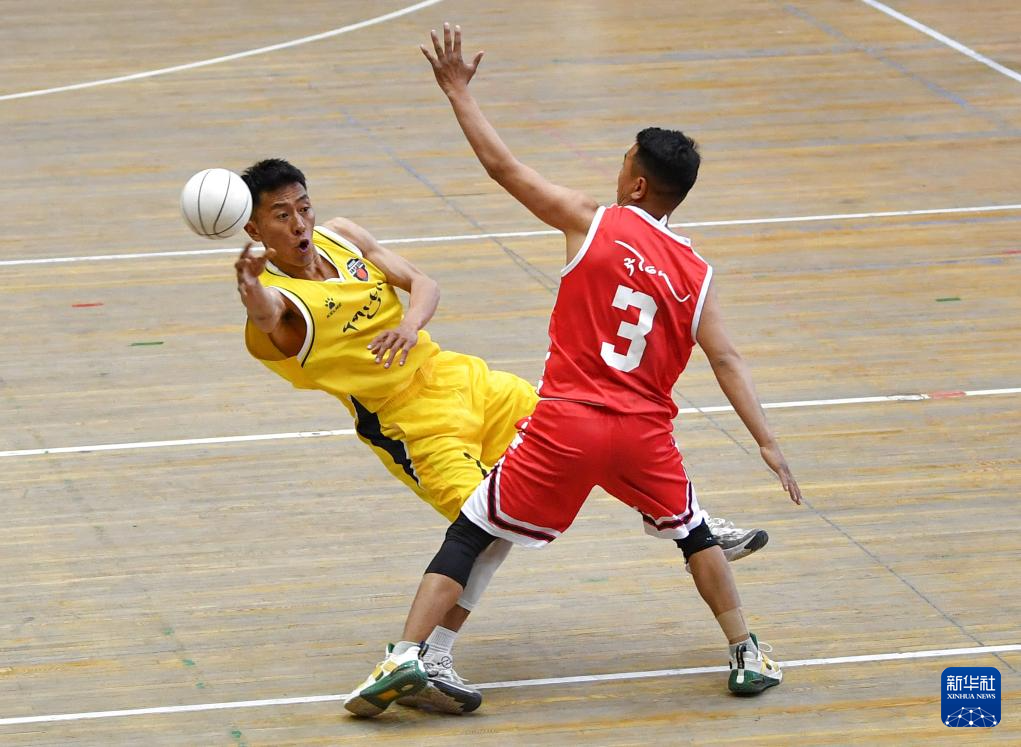 5月14日,那曲隊(duì)次仁多吉(左)在比賽中傳球。新華社記者 晉美多吉 攝